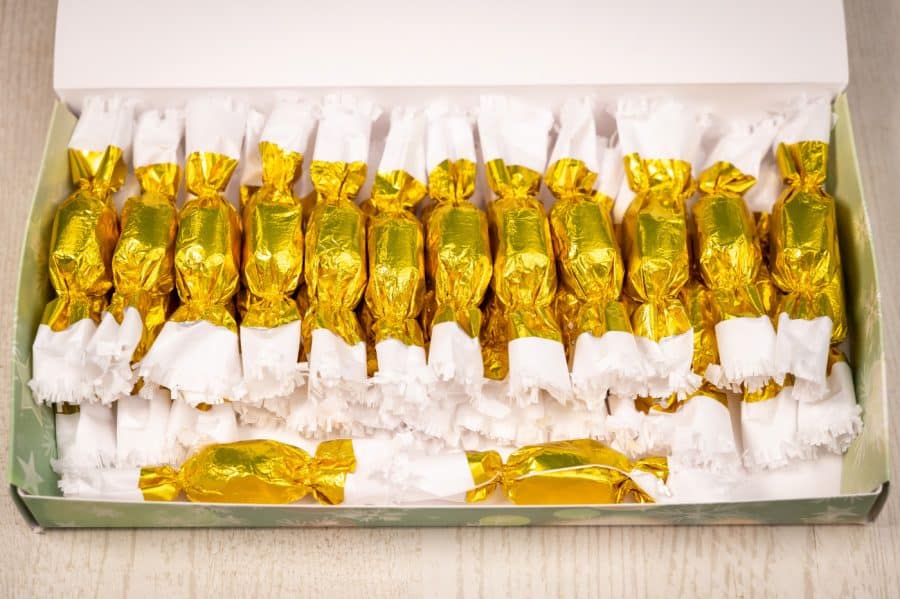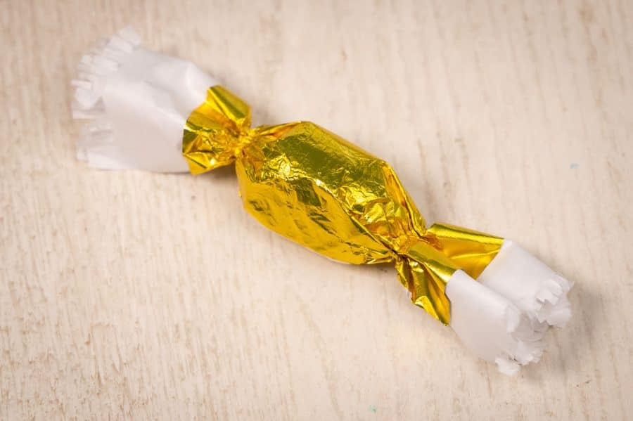 Mogyorónugátos tejcsokoládékrémmel töltött kézműves szaloncukor, tejcsokoládé burokban.